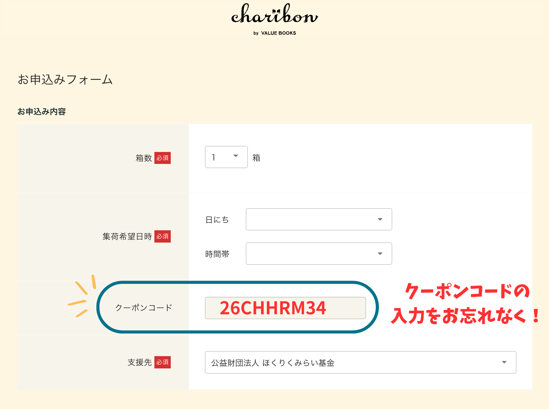 通常のチャリボンお申し込みフォームをご利用の場合は、申込画面にて以下のコードをご入力ください。