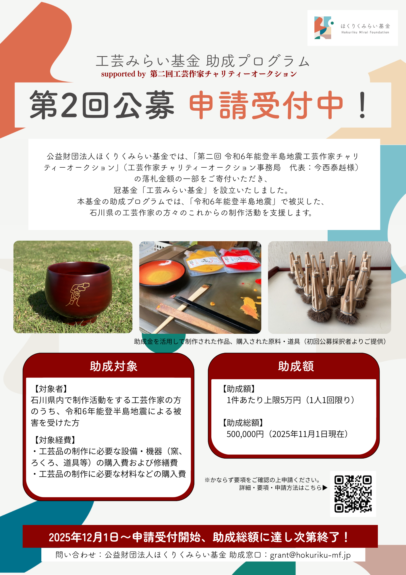 この度、公益財団法人ほくりくみらい基金では、「第二回 令和6年能登半島地震工芸作家チャリティーオークション」(工芸作家チャリティーオークション事務局 代表:今西泰赳様)の落札金額の一部をご寄付いただき、冠基金「工芸みらい基金」を設立いたしました。